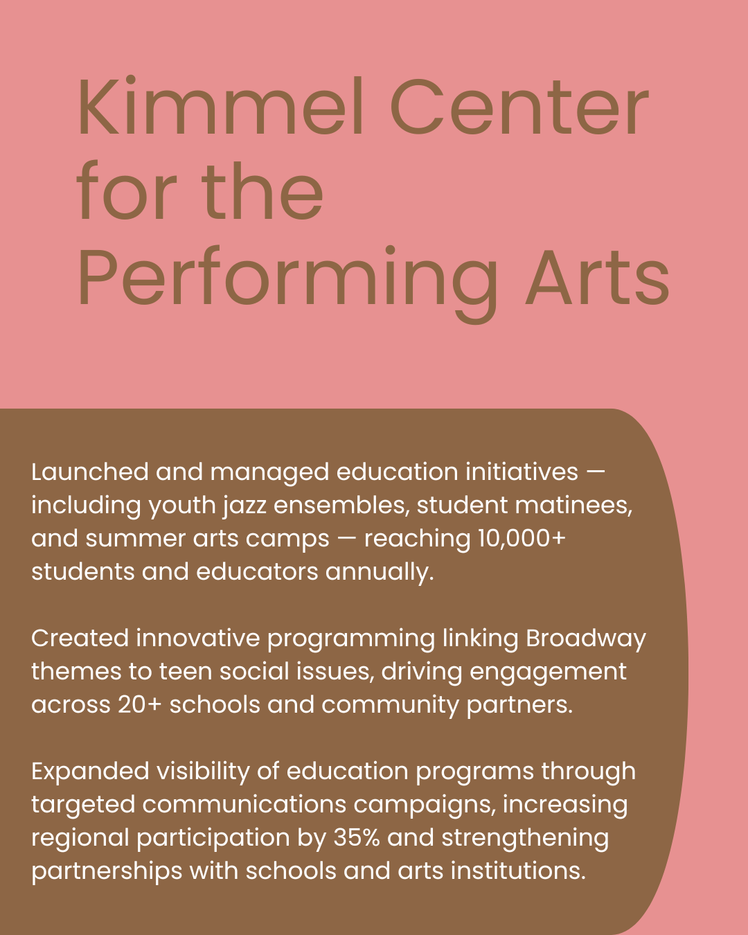 At Kimmel I designed and delivered education programs that connected Broadway stages with classrooms and communities, building partnerships and cultural experiences that reached thousands across Philadelphia.